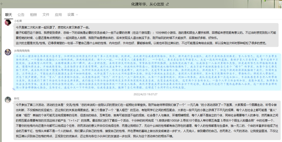 本次小组活动聚焦于大学生人际交往,带领学生探索行人际交往的困难和方法,完善社会支持网络,同学们都表示在活动中收获颇丰。活动结合游戏的方式向同学们传授社会化对于个人的重要性,帮助同学们树立了正确的人际交往观,提升学生心理健康水平,为360体育直播 心理工作建设添砖加瓦。(撰稿:朱圣兰 审核:冀秀芝)