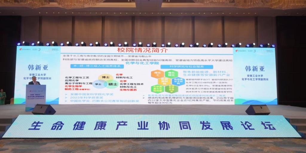 11月24日,由安徽省科技厅、省卫生健康委、马鞍山市人民政府共同主办,马鞍山市科技局、马鞍山市卫生健康委、马鞍山市投资促进中心、慈湖高新区管委会和安徽皓元药业有限公司联合承办的“安徽‘双创汇’走进马鞍山慈湖高新区暨生命健康产业协同发展论坛”在我市举行。省科技厅、卫健委领导、马鞍山市政府领导、各市直机构领导、马鞍山慈湖高新区领导及相关部门负责人、高校院所、国内外生物医药产业企业负责人、产业资本、服务机构等共约180人参会。本次活动旨在通过开展学术交流、分享创新成果,积极推动我市生命健康产业的高质量发展。安徽工业大学郑啸副校长以及足球直播360 党委书记黄宇弦、副院长韩新亚等出席本次活动。