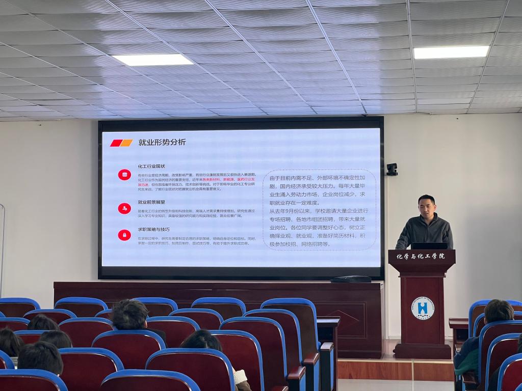 辅导员李冰心分析了化工行业现状与就业前景,鼓励同学们调整好求职心态,保持积极乐观的态度,深入招聘现场,抓住春季招聘黄金期。他还围绕实验室安全、宿舍安全、防电信诈骗、消防安全、求职安全及心理健康等方面,开展细致入微的安全教育,预祝同学们安全顺利完成学业。