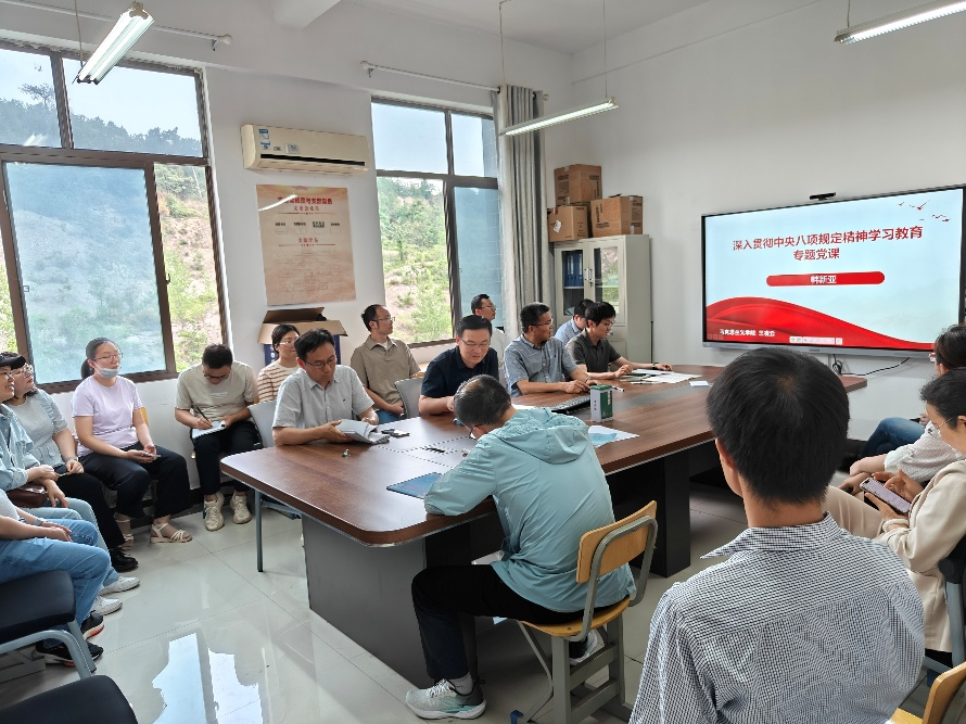 2025年5月26日下午,足球直播360 副院长(主持工作)韩新亚在应用化学系党支部,开展以《八项规定:长期有效的铁规矩、硬杠杠》为题的专题党课活动。活动由应化系党支部书记吴孔林主持,全体党员及系室干部参加学习。
