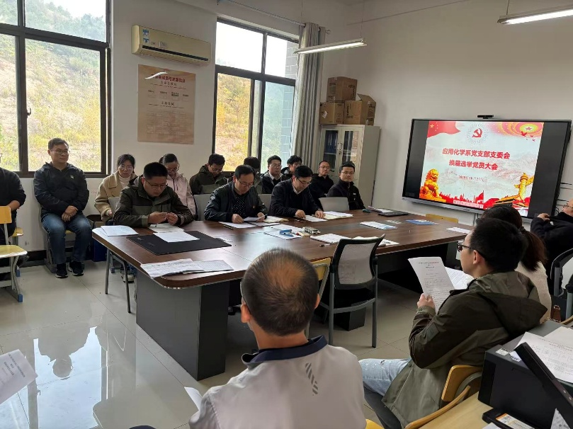 随后,应用化学系党支部召开了新一届支部委员会第一次会议,通过投票方式选举吴孔林为党支部书记,并决定了其他支委工作分工。新一届支委进行了第一次政治学习,吴孔林带领学习了党的二十届四中全会精神,大家在一起进行了热烈研讨。大家纷纷表示,新一届支部委员会将始终坚持以习近平新时代中国特色社会主义思想为指导,聚焦落实立德树人根本任务,以“支部党建、意识形态、安全稳定、学科发展、教书育人”为工作重心,充分发挥党支部的战斗堡垒和模范带头作用,全面推进党支部各项事业高质量发展。(撰稿:吴孔林 审核:韩新亚、黄宇弦)