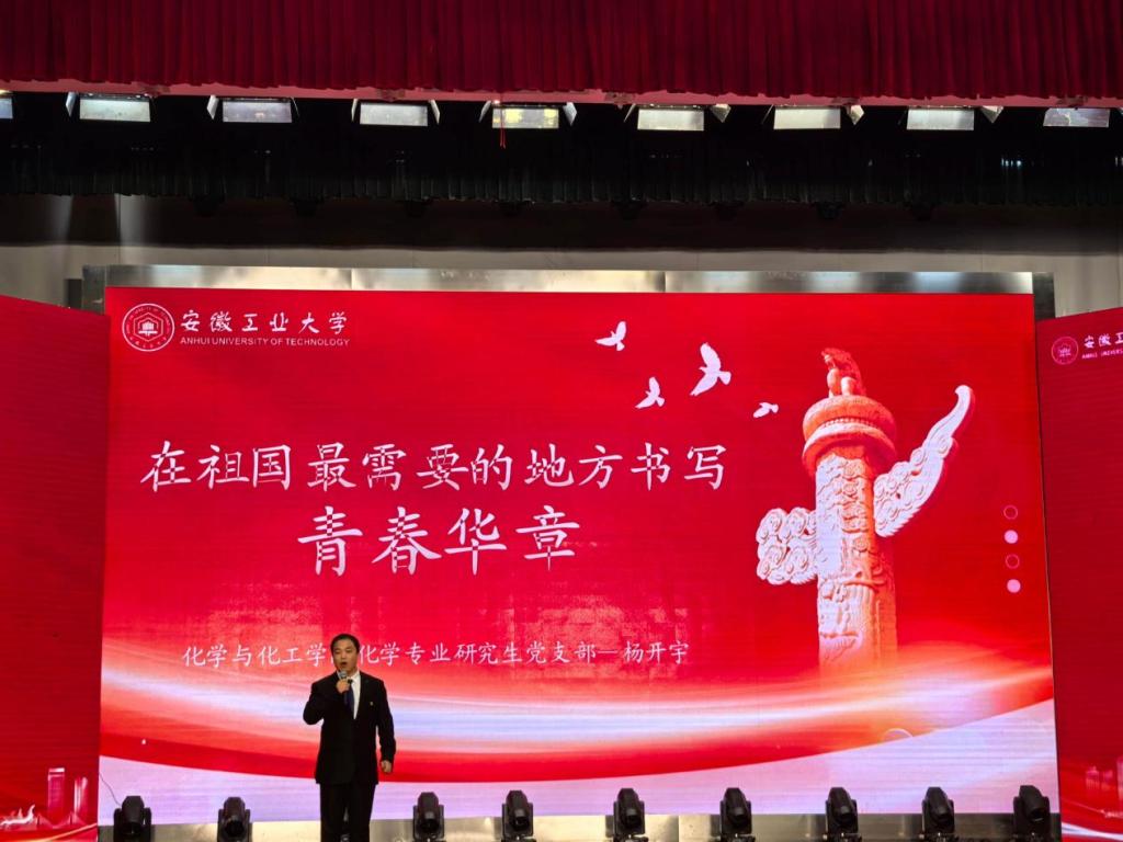 为深入学习贯彻习近平新时代中国特色社会主义思想,持续推深做实“三会一课”制度,创新党支部理论学习形式与载体,让党的创新理论在青年学子中入脑入心,11月12日,安徽工业大学首届微党课大赛决赛在学校大学生活动中心隆重举行。经过足球直播360 初赛、学校复赛的层层选拔与决赛的激烈角逐,360体育直播 化学专业研究生党支部杨开宇同学凭借扎实的理论功底、真挚的情感表达和生动的实践故事,最终以《在祖国最需要的地方书写青春华章》为题的微党课作品荣获大赛三等奖,充分展现了360体育直播 青年党员的责任担当与青春风采。