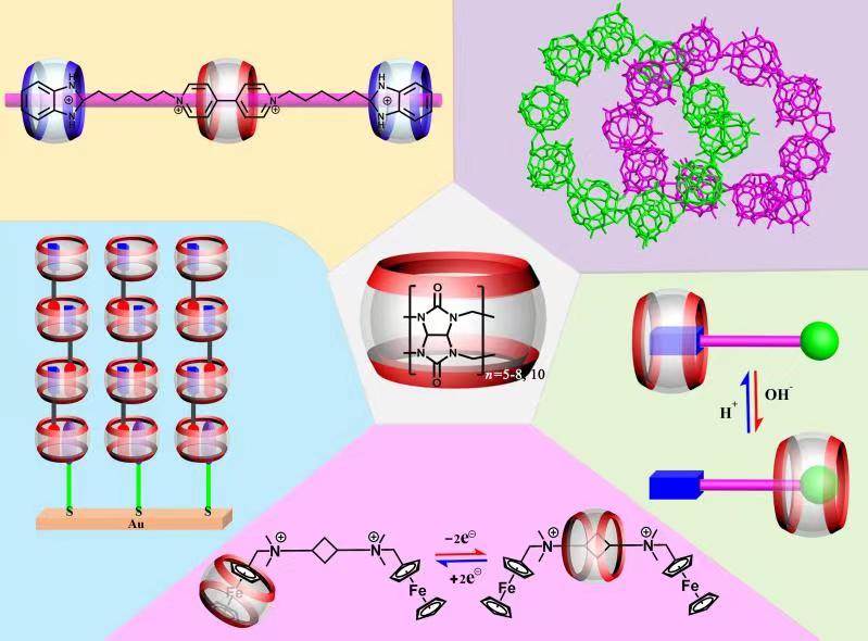 该综述结合课题组前期系列研究成果,总结了近二十年来瓜环(葫芦脲)同系物和衍生物作为环状的“轮”,在构筑各种机械互锁分子领域的重要进展,揭示了不同聚合度瓜环疏水空腔与其构筑的机械互锁分子的空间结构之间的相互关系:对于聚合度最低的五元瓜环,由于其空腔太小线状的分子轴无法从中穿过,它只能通过与金属离子配位的方式形成机械互锁分子;对于聚合度较高的六、七、八元瓜环,它们的空腔适合包结合适尺寸大小的各种分子轴,通过各种外界刺激条件的调控,结合在分子轴的不同位置,形成各种刺激响应的机械互锁分子;尤其是八元瓜环的空腔足以容纳相同或相异的两个客体分子,形成氧化—还原响应的机械互锁分子或超分子聚合物;对于十元瓜环而言,其大空腔能够包裹纳米尺寸的螺旋束作为分子轴,对未来机械互锁分子在医药科学和功能材料应用等研究提供了前瞻性的观点。