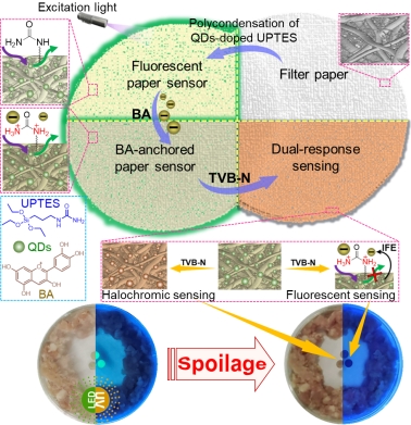 (基于颜色变化和荧光响应的非接触式食品新鲜度双模传感原理示意图)