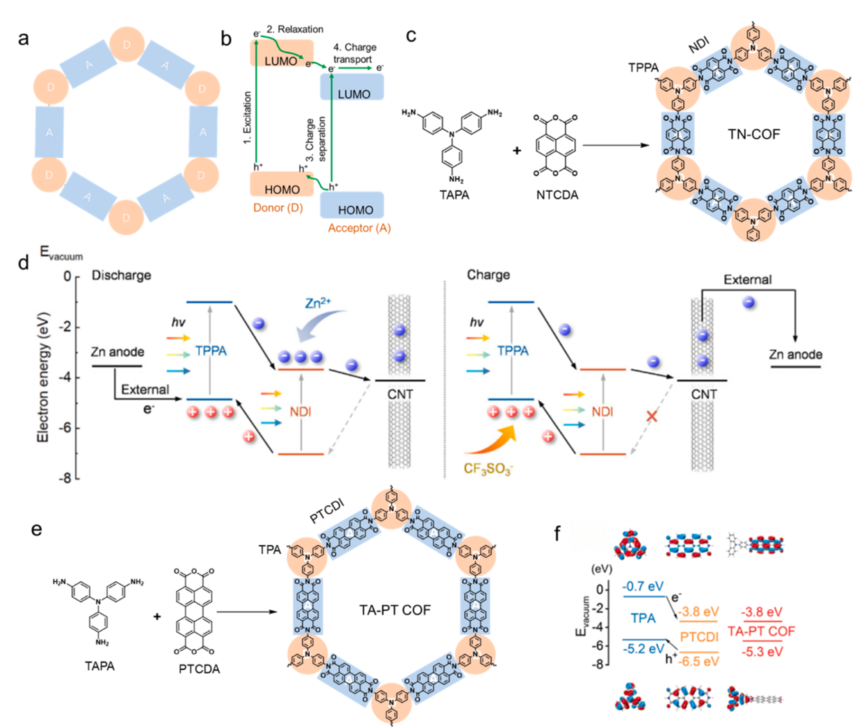 COFs作为正极材料可以解决有机分子的溶解问题,从而显著提高长期循环稳定性。硼环、烯烃、咪唑等连接基团难以作为储能活性位点,且会降低材料的整体比容量。只有富含吩嗪和亚胺、羰基官能团的可以作为储能位点的COFs作为正极材料才能够有较高的比容量。双功能COFs中电子给体和电子受体单位的周期性排列将促进电荷的分子间分离和传递。此类D-A-COFs作为光响应正极材料可以集光电转换功能和电化学氧化还原位点于一体,收集光后产生光电子和空穴,为氧化还原反应提供能量。作为隔膜或保护层的COFs,其极性基团不仅对Zn表面具有较高的吸附能力,而且可以调节Zn2+的透过率。孔内壁的周期性结构使COFs具有良好的调节作用,可以减缓Zn枝晶产生和H2的析出。