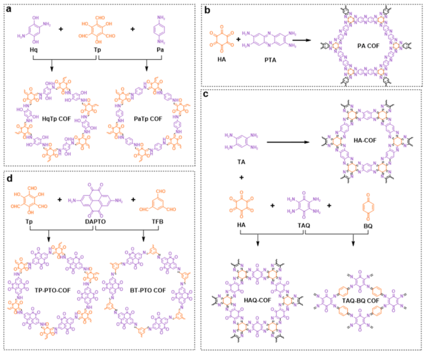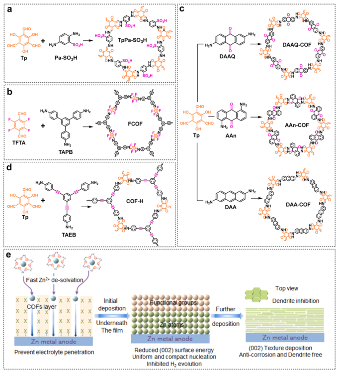 可充电水性锌电池(AZBs)已成为电网规模储能电池系统的理想选择之一。然而,其在实际应用中受到比能、循环稳定性和保质期等不理想因素的阻碍,通常是由于在充放电过程中正极材料的降解和锌负极的枝晶/腐蚀等原因造成的。在过去的几年里,共价有机框架(COFs)由于其可设计的分子结构、特殊的有序孔道和可调节的功能分子单元,已经被用于解决了水性锌电池中的固有问题。COFs由于有效储能组分的可行掺入和共价键结构的高稳定性,可以解决充放电过程中正极材料溶解的问题。通过建立基于COFs的界面层来均匀离子通量,提供更多的成核种子,抑制腐蚀反应,可以很好地延缓锌负极的枝晶和腐蚀问题。