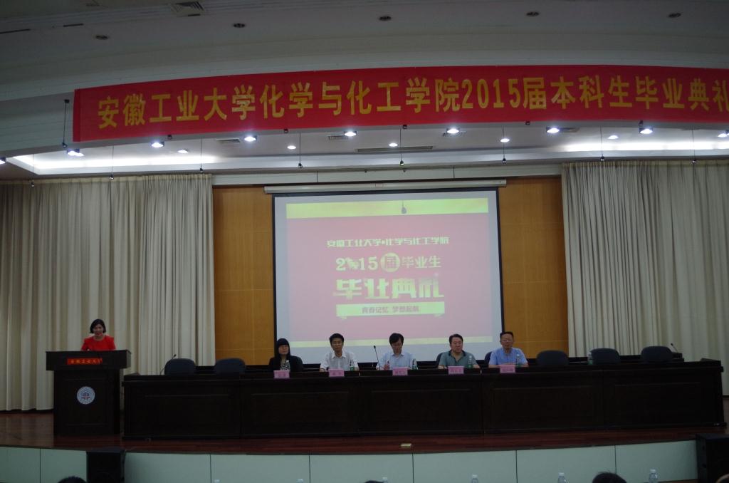 会议中嘹亮的国歌声中拉开帷幕。院长崔平宣读了《关于表彰2015届安徽省品学兼优毕业生、安徽工业大学品学兼优毕业生的决定》;毕业生代表化114班杨凤新、在校生代表化132班赵轩以及教师代表夏友谊分别发言。