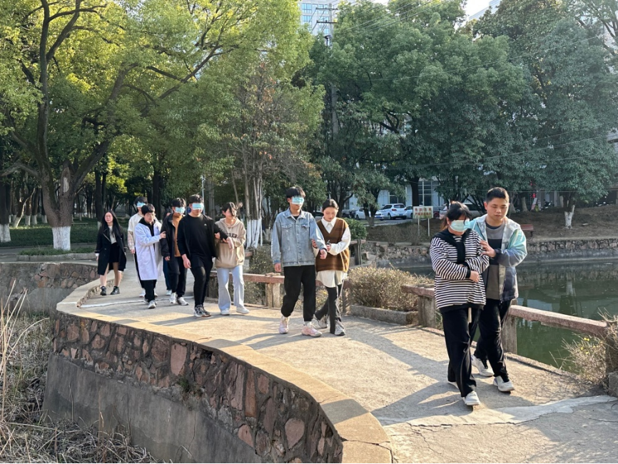 本次活动主题是“朋友对对碰”,活动以社会支持理论为支撑、以心理社会治疗模式为方法来开展。活动首先以为“一毛五角”抱团小游戏来暖场,小组气氛在游戏中逐渐热烈起来。随后进入主体游戏----“盲人与哑巴”,在这个游戏中,所有组员两两组合,一个学生在游戏过程中戴眼罩扮演盲人,另一个则是在游戏中不可说话,扮演哑巴。通过哑巴的引导,盲人需要从起点过障碍到达湖心亭,到达后角色互换,回到出发地。通过这样的方式,让学生体检人际交往中直接和间接的沟通技巧,了解信任、勇气、真诚在人际交往中的重要性。