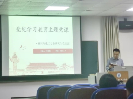 近日,材料与化工专业研究生党支部书记李宏强以“深入开展党纪学习教育,做到学纪、知纪、明纪、守纪”为主题,为全体支部党员同志开展了一场极具意义的党纪学习教育主题党课。