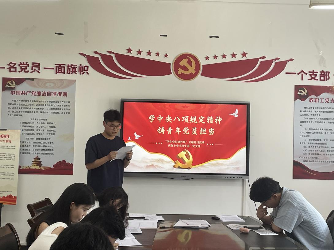 为深入贯彻中央八项规定精神学习教育,加强学生党员队伍建设,强化纪律意识和规矩意识。应化专业本科生第一党支部以“学中央八项规定精神,铸青年党员担当”为主题,组织开展“学生党员谈作风”主题党日活动。