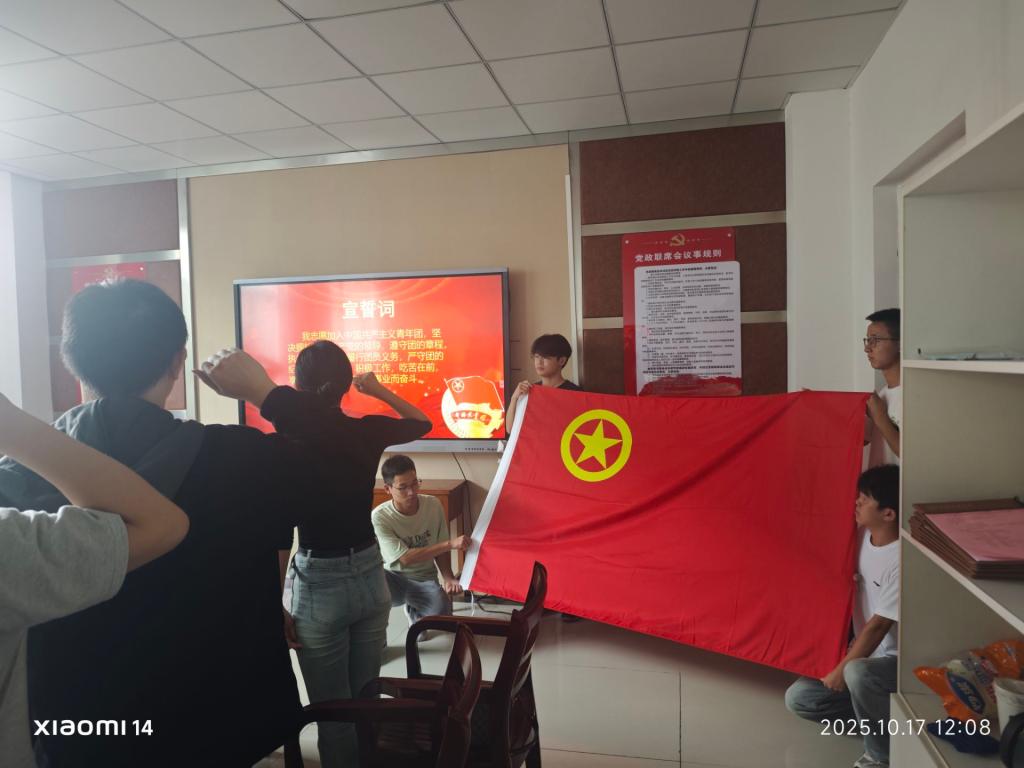 在老团员代表王浩宇的带领下,全体新团员举起右拳,面向鲜红的团旗庄严宣誓:“我志愿加入中国共产主义青年团……”铿锵有力的誓言回荡,既展现了新团员加入团组织的坚定决心,也彰显了新时代青年紧跟党、跟党走的信念与担当。