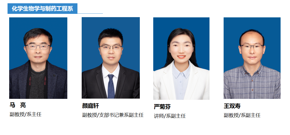 化学生物学与制药工程系现有专任教师16人,包括教授3人,副教授5人,博士生导师4人,硕士生导师11人,全部具有博士学位,其中海外获得博士学位教师5人;拥有国家级高层次人才、安徽省高校杰青、安徽省青年拔尖人才、安徽省教学名师和安徽省战略性新兴产业技术领军人才等省级以上人才5人。近5年,共承担国家重点研发计划政府间国际科技创新合作重点专项任务、国家自然科学基金面上项目等国家级科研项目13项,安徽省教育厅杰出青年科研项目、安徽省重点研究与开发计划项目等省部科研项目16项,建有安徽省能源材料绿色制造与生物技术国际联合研究中心、安徽工业大学生物化工研究中心等一系列科研平台以及完善的本科专业实验室,包括细胞生物学实验室、微生物学实验室、生物化学与分子生物学实验室、药物合成实验室、天然药物化学实验室、药物剂型与分析实验室、化学生物学综合实验室以及化学生物学实训室等。