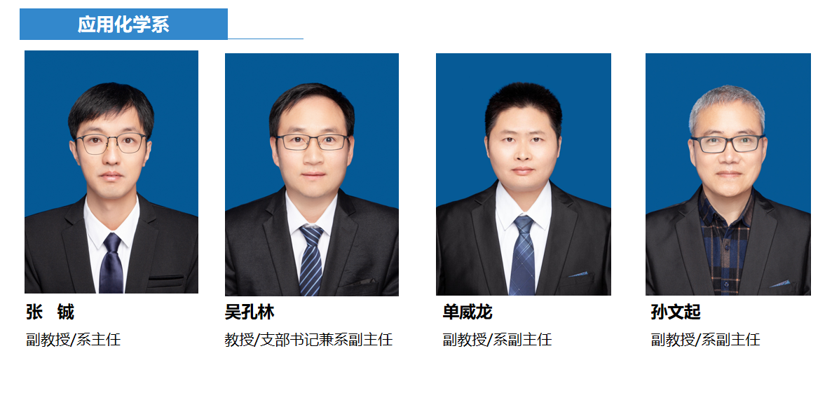 应用化学系师资力量雄厚,拥有学历、职称、年龄梯度分布合理的教师队伍。目前,专职教师33人,教授12人、资格教授4人、副教授12人、资格副教授2人、讲师3人,拥有海(境)外背景博士9人;博士生导师9人、硕士生导导师22人;国家级2人(含柔性引进长江学者、国家杰青兼职教授1人)、省部级人才6人。近年来,年均研究经费200余万元、申请国家发明专利20余项、发表SCI/EI收录国际学术论文80余篇;近五年承担了国家自然科学基金、省部级项目50余项;承担教研项目10余项;积极开展校企合作,为企业解决技术难题50余项。专业十分注重学生研究能力的培养,本科生参与国家级科研项目及创新创业人才培养训练计划人数达65%以上,近五年本科生获得各类科技竞赛奖项100余项。组建了无机-有机杂化光电材料、先进材料与现代光谱技术等极具特色的研究团队,在国内外相关领域产生了积极影响。